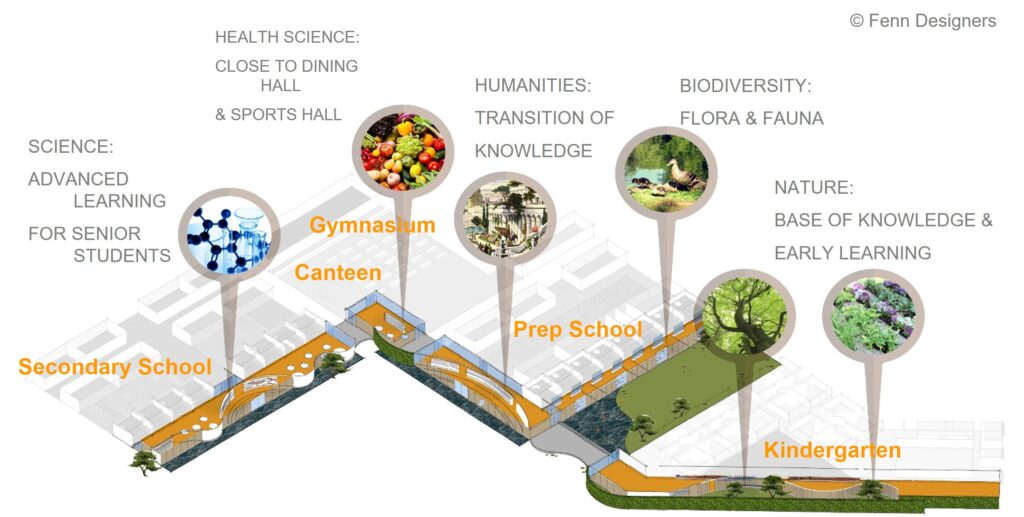 We combined the main connectivity axis of all teaching buildings, the canteen, and the gymnasium into the Learning Resource Centre.