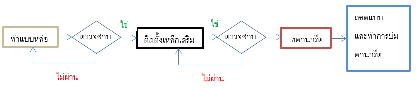 ขั้นตอนในการทำงานเพื่อให้ได้ตอม่อ คาน เสา และพื้นหล่อกับที่นั้น มีขบวนการโดยย่อดังนี้