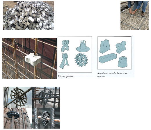 ถึงขั้นตอนที่ผู้รับเหมาทำการผูกเหล็ก สังเกตุดูว่าเหล็กสะอาด ใม่มีสนิม เหล็กปลอกเรียงได้ระยะสม่ำเสมอ ไม่มีส่วนของเหล็กติดไม้แบบ ซึ่งถ้าผู้รับเหมาที่ดี เขาจะทำการหล่อลูกปูน (Concrete spacer) กั้นระหว่างผิวไม้แบบและปลอกเหล็ก ทำให้เมื่อถอดแบบออกมาแล้วเหล็กเสริมจะมีระยะหุ้มคอนกรีตอย่างเหมาะสม ซึ่งลูกปูนมีหลากหลายชนิดมาก บ้านเราส่วนใหญ่ผู้รับเหมามักจะหลอ่ขึ้นมาเอง ทั้งเป็นเหลี่ยม หรือกลม ดังรูปแรกด้านล่าง ซึ่งก็ใช้ได้ดีทีเดียว