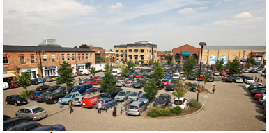 2. จัดที่จอดรถและทางวิ่งบนที่ว่างของโครงการและสร้างอาคารไว้ด้านหนึ่งหรือโดยรอบ วิธีนี้เหมาะกับโครงการขนาดไม่ใหญ่มาก การจัดที่จอดรถแบบนี้จะได้พื้นที่จอดรถที่มีราคาค่าก่อสร้างต่ำ ไม่ต้องนำพื้นที่นี้มาคิดเป็นพื้นที่อาคาร ทำให้จัดที่จอดรถชิดเขตที่ดินได้ สำหรับโครงการที่ติดปัญหาเรื่องขนาดพื้นที่อาคารและการออกแบบอาคารที่ไม่อยู่ในข่ายที่ต้องทำรายงานผลกระทบสิ่งแวดล้อม (EIA) ก็สามารถใช้แนวทางนี้ได้