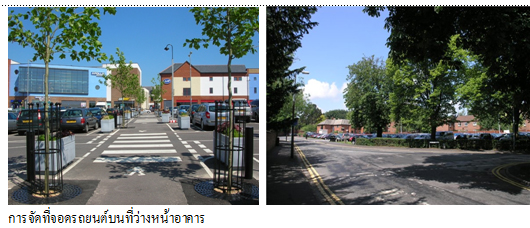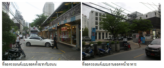 1. จอดรถด้านหน้าอาคาร สำหรับอาคารขนาดเล็ก ไม่มีพื้นที่โครงการใหญ่มากและมีที่ดินหน้ากว้างติดถนน การจอดรถแบบเฉียงไปตามแนวถนนดูจะเป็นสิ่งที่น่าจะจัดทำ เพราะใช้พื้นที่ในการจอดรถยนต์น้อย สามารถใช้พื้นที่บริเวณนี้เป็นที่ว่างด้านหน้าอาคาร และไม่นับเป็นพื้นที่อาคารอีกด้วย แต่การจอดรถแบบนี้อาจสร้างปัญหาให้กับการจราจรได้โดยง่าย ทุกครั้งที่มีการเข้าจอดหรือออกจากที่จอดรถ จะมีการชะลอตัวของการจราจร บางครั้งสามารถก่อให้เกิดอุบัติเหตุได้โดยง่าย