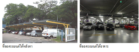 4. จัดที่จอดรถยนต์นอกอาคารและจัดสร้างหลังคาคลุม รูปแบบที่จอดรถแบบนี้มีเห็นได้ทั่วไป หลังคามีหลายแบบ ไม่ว่าจะเป็นโครงสร้างแบบถาวรที่เป็นเหล็ก กระเบื้อง ไปจนถึงหลังคาแบบกึ่งถาวรที่ใช้ตาข่ายพลาสติกมาทำหลังคา การจัดสร้างที่จอดรถแบบนี้ถือว่าเป็นอาคารเนื่องจากมีความสูงเกิน 1.10 เมตร จึงต้องมีการเว้นระยะตามที่กฎหมายกำหนดและนำไปคิดรวมกันพื้นที่อาคารรวม ราคาค่าก่อสร้างยังมีราคาไม่สูงมาก ขึ้นอยู่กับวัสดุที่เลือกใช้ ในการออกแบบสามารถสร้างหลังคาให้ต่อเนื่องกันเป็นทางเดินที่กันแดดกันฝนได้ในระดับหนึ่ง