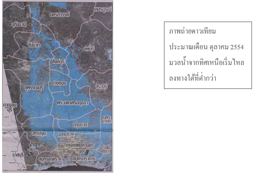ภาพถ่ายดาวเทียม ประมาณเดือน ตุลาคม 2554 มวลน้ำจากทิศเหนือเริ่มไหลลงทางใต้ที่ต่ำกว่า เพื่อไหลลงทะเล