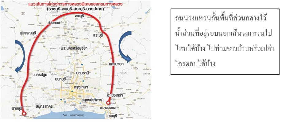 ถนนวงแหวนกั้นพื้นที่ส่วนกลางไว้ น้ำส่วนที่อยู่รอบนอกเส้นวงแหวนไปไหนได้บ้าง ไปท่วมชาวบ้านหรือเปล่า ใครตอบได้บ้าง