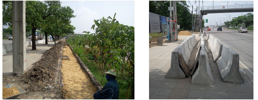 - เอาแท่งคอนกรีตขนาดใหญ่ไปปิดกั้นตามแนวถนน ดูรูป กทมอ้างว่าวางไว้ไม่เดือดร้อนใครเพราะวางบนเขตทางของกทม การวางก็แสนง่ายเพียงเทคอนกรีตหยาบบางๆ แล้วก็เอาแท่งคอนกรีตหนัก ท่อนละ 1 ตันวางไว้ เพื่อป้องกันน้ำท่วม โดยใช้งบประมาณมหาศาล จากภาษีที่เราท่านได้เสียไปให้แก่รัฐบาลนำไปใช้จ่ายอย่างนี้