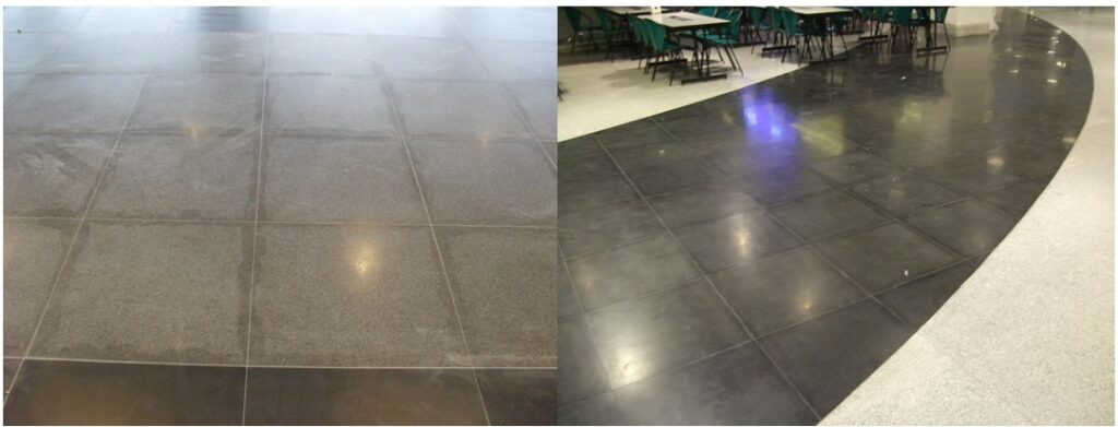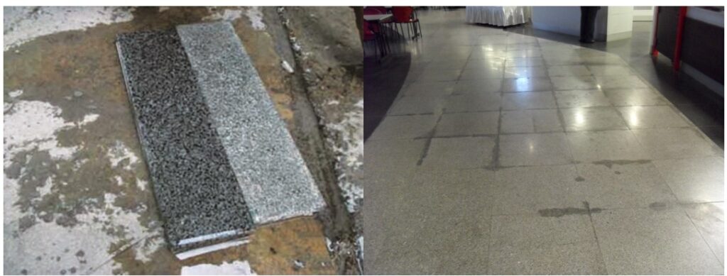 สิ่งที่เกิดหลังจากการขัดบริเวณขอบหินคือ ระบบกันซึมที่ได้ทำไว้หลุดไปขณะขัดหินให้บางลง เมื่อผู้รับเหมาพยายามที่จะทาน้ำยากันซึมใหม่ในระยะเวลาที่ไม่เหมาะสม และจากนั้นขัดด้วยแวกซ์ จึงทำให้สีของหินไม่เหมือนกันตรงบริเวณขอบหิน รูปด้านบนซ้ายผู้รับเหมาพยายามใช้สีผสมกับแวกซ์เพื่อแก้ไข ก็ไม่ได้ผลเช่นกัน รูปด้านบนขวาแม้เป็นหินสีดำก็เกิดปัญหาเช่นเดียวกัน