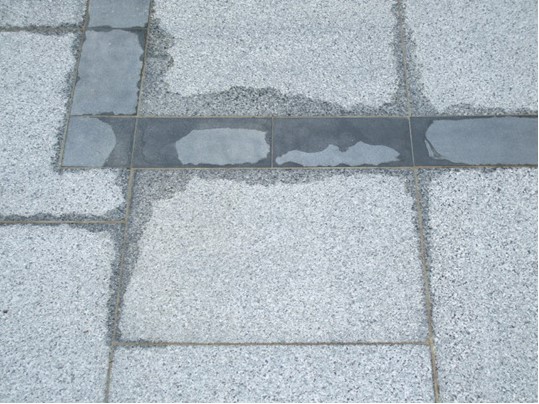 3. การปูหินไม่ได้ระดับ จะแสดงผลตอนพื้นเปียกน้ำและเกิดน้ำขังเป็น จุด ๆ การแก้ไขคือการรื้อและปูใหม่