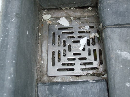4. การปูหินโดยไม่ได้ตรวจสอบระยะรูระบายน้ำที่พื้น พบได้ทั่วไปบริเวณรางระบายน้ำที่ทำเป็นพื้นลดระดับ ผู้รับเหมาที่ขาดความระมัดระวัง อาจปูหินทับการเปิดของฝารูระบายน้ำที่พื้นตามภาพด้านล่าง