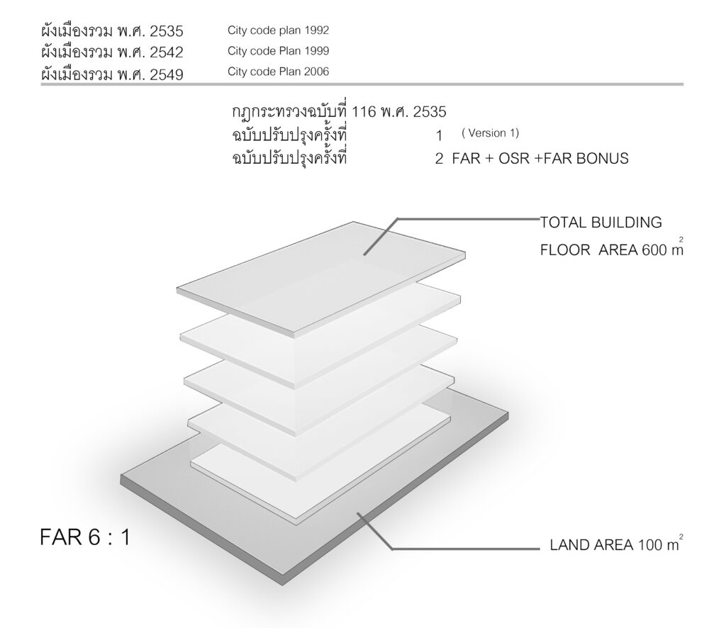 The current City Planning of Bangkok Update no 2 (year 2006) added  floor area ratio requirements (Floor Area Ratio or FAR) and open space ratio (OSR).
