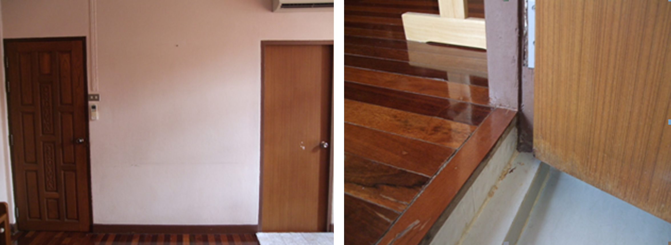 วงกบประตูห้องน้ำทางขวาที่เตี้ยกว่าประตูห้อง วงกบและบานประตูห้องน้ำที่ลดระดับต่ำกว่าพื้นห้อง
